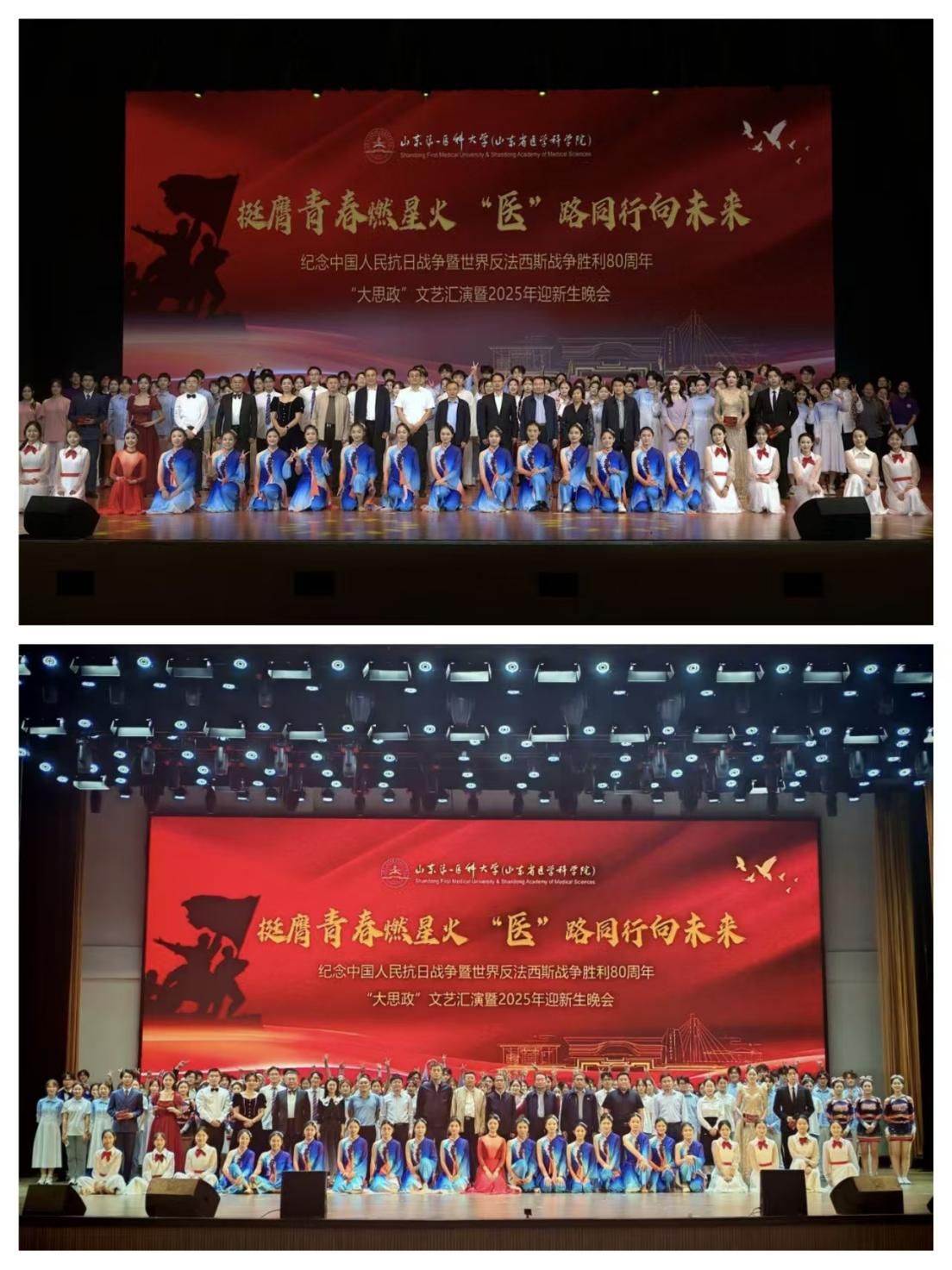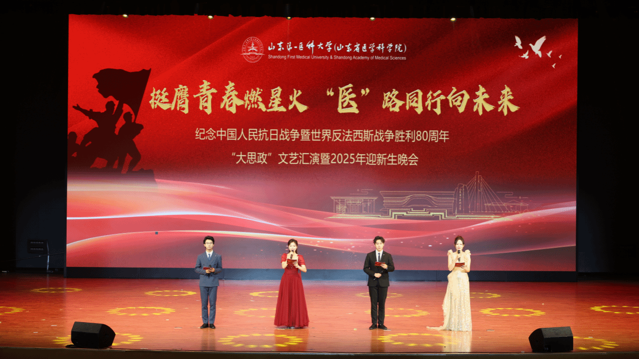 挺膺青春燃星火,“医”路同行向未来。9月28日、29日晚,校(院)在济南、泰安两校区举行纪念抗日战争暨世界反法西斯战争胜利80周年“大思政”文艺汇演暨2025年迎新生晚会。校(院)党委副书记王宇轩,党委委员、副校(院)长贾海宁、张继国,党委委员、组织部部长闫栋出席并观看演出。