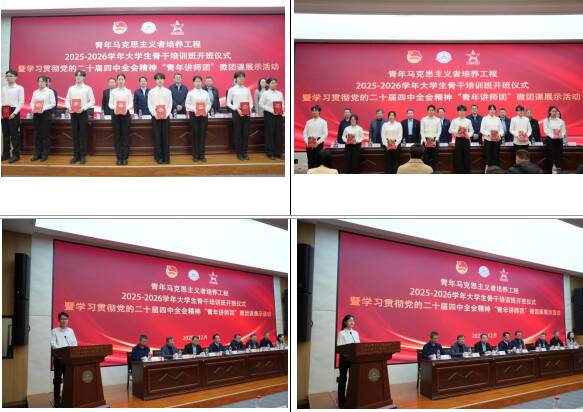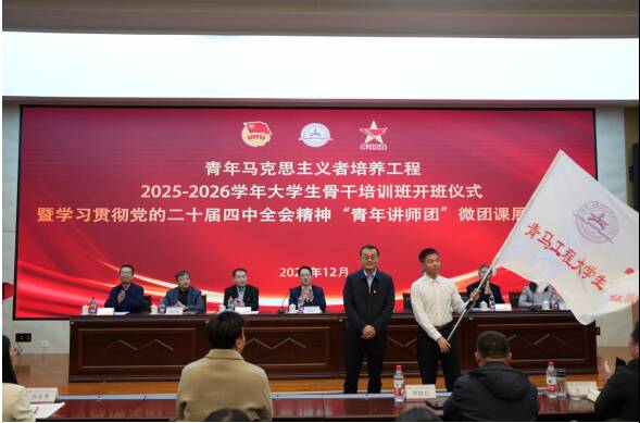 与会领导为2024-2025学年青马班学员代表颁发结业证书;向2025-2026学年青马班学员代表赠送理论学习书籍;校(院)团委负责同志介绍了本期培训班整体情况及培养方案;学员代表作了表态发言。