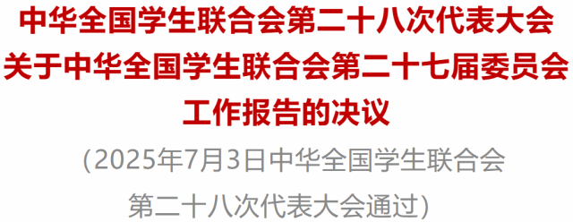 中华全国学生联合会第二十八次代表大会听取和审议了徐辉同学代表全国学联第二十七届委员会所作的工作报告。报告坚持以习近平新时代中国特色社会主义思想为指导,全面总结了在以习近平同志为核心的党中央坚强领导下学联学生会过去五年的工作,阐述了习近平总书记对新时代青年学生的重要要求,明确了新时代新征程学联学生会工作的根本遵循,谋划了未来五年学联学生会的工作方向和重点任务,提出了学联学生会未来一个时期深化改革的思路和举措。大会决定批准这一报告。